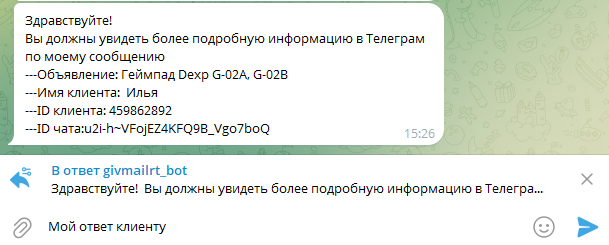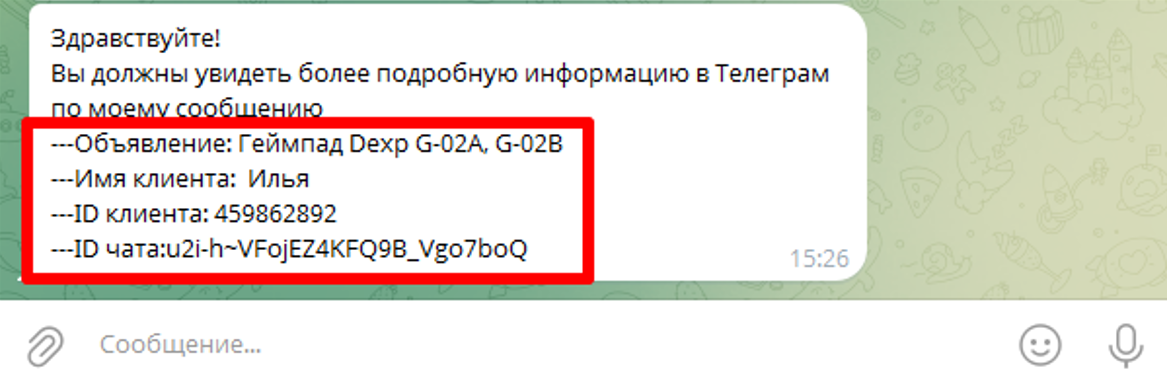 В итоге сообщение клиента с Авито будет приходить в Telegram в таком виде: