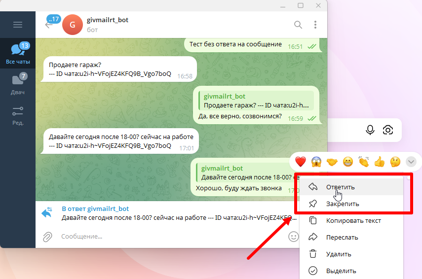 Обратите внимание, что отвечать клиенту в Телеграм нужно будет всегда ответным сообщением. В Телеграм переписка с клиентом будет выглядеть так: