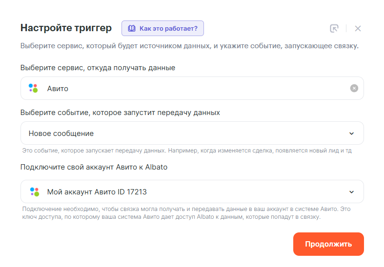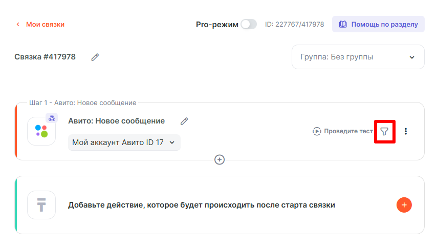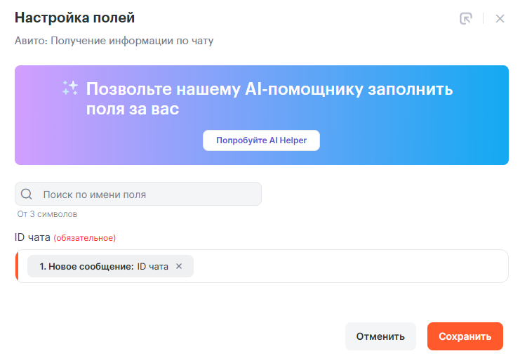 Шаг 2 — Авито: Получение информации по чату настраивается просто:
