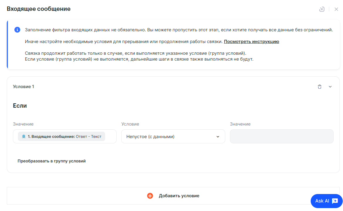 Триггер «Авито: Новое сообщение» будет реагировать на любое сообщение в чате, даже на то, которое Вы отправили в этом чате и на Системные сообщения. Поэтому, для правильной передачи сообщений нужно настроить Фильтр входящих данных.