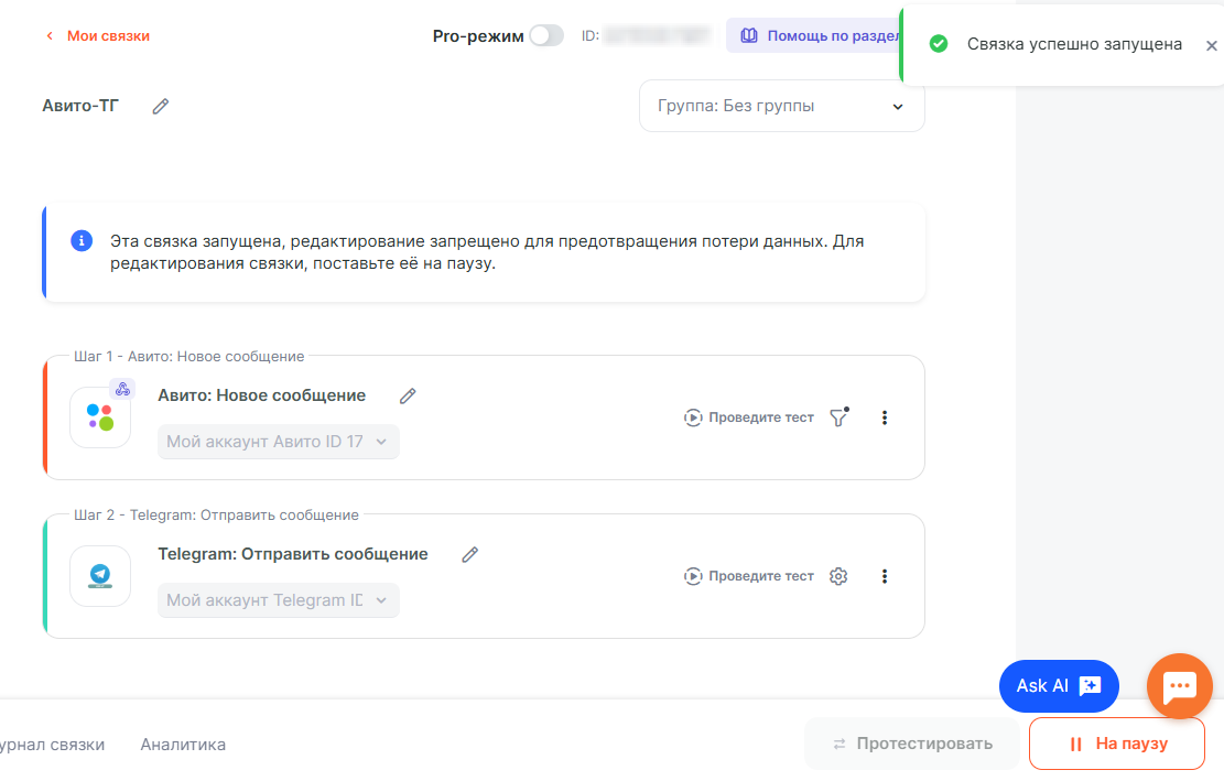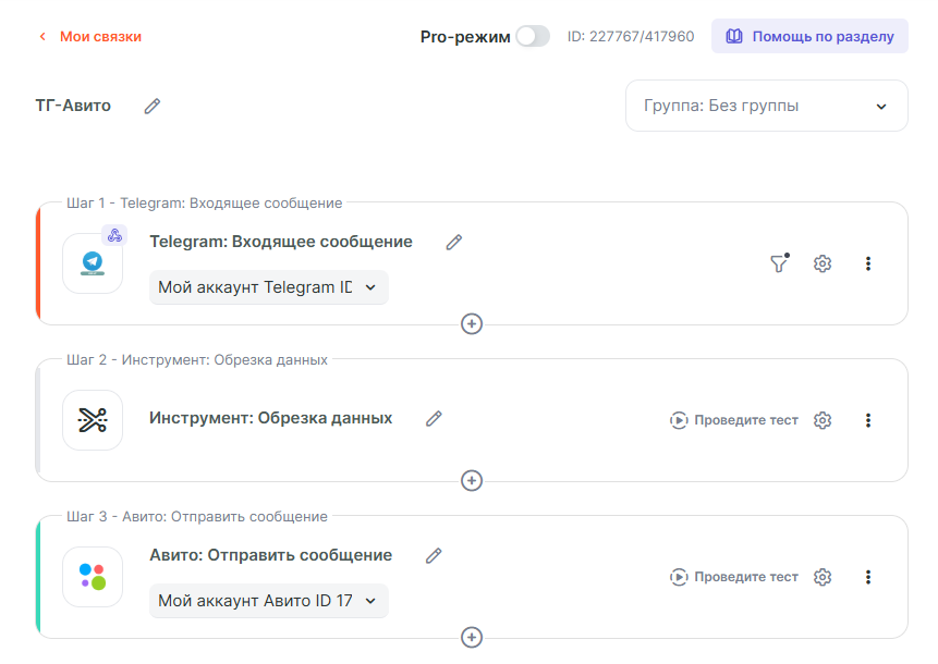 Далее, нужно будет создать 2 связки. Одна связка будет отправлять полученные от клиента сообщения из Avito в Ваш Telegram чат, другая позволит отправлять Ваши ответы из Telegram обратно в чат с клиентом Avito.