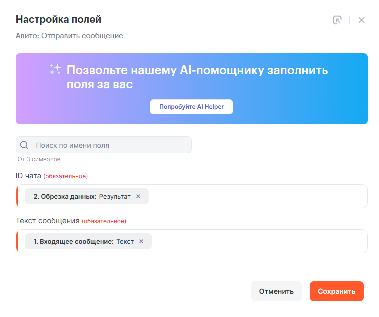 - Текст — выбираем поле Авито: Текст сообщения, жмем Enter. Прописываем текст: —ID чата: и выбираем поле Авито: ID чата.