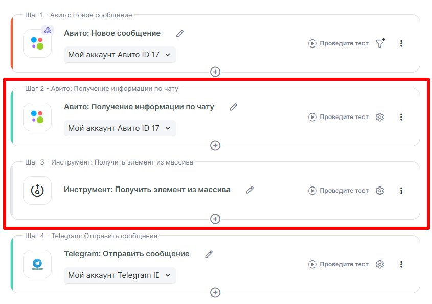 В таком случае, в первой связке Avito → Telegram нужно будет добавить 2 шага, для получения и передачи более подробной информации, например, Имя клиента, ID клиента Авито и проч.
