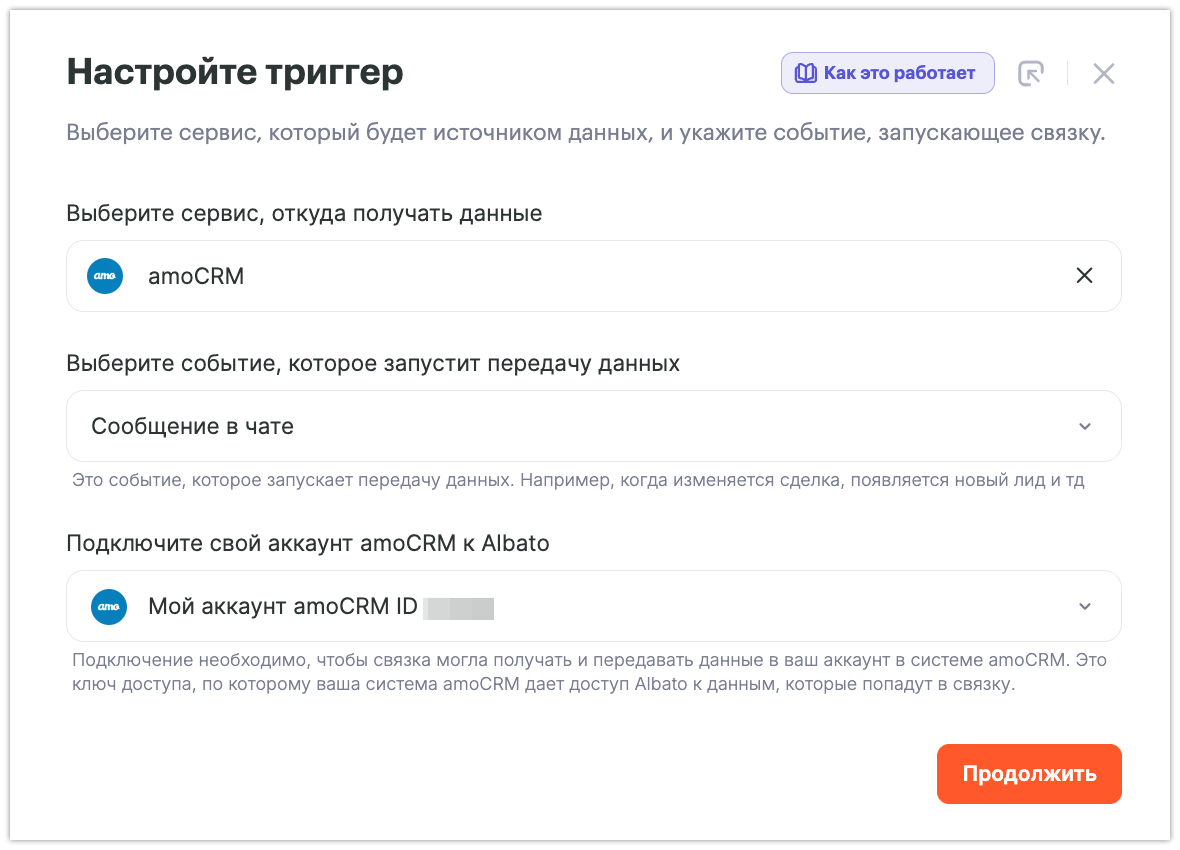 • Сервис, из которого передавать данные — amoCRM.
