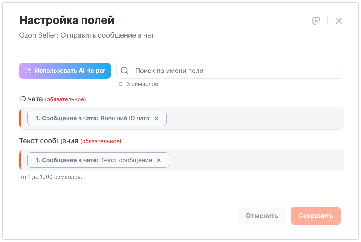 Заполните поля шага Ozon Seller – Отправить сообщение в чат.
