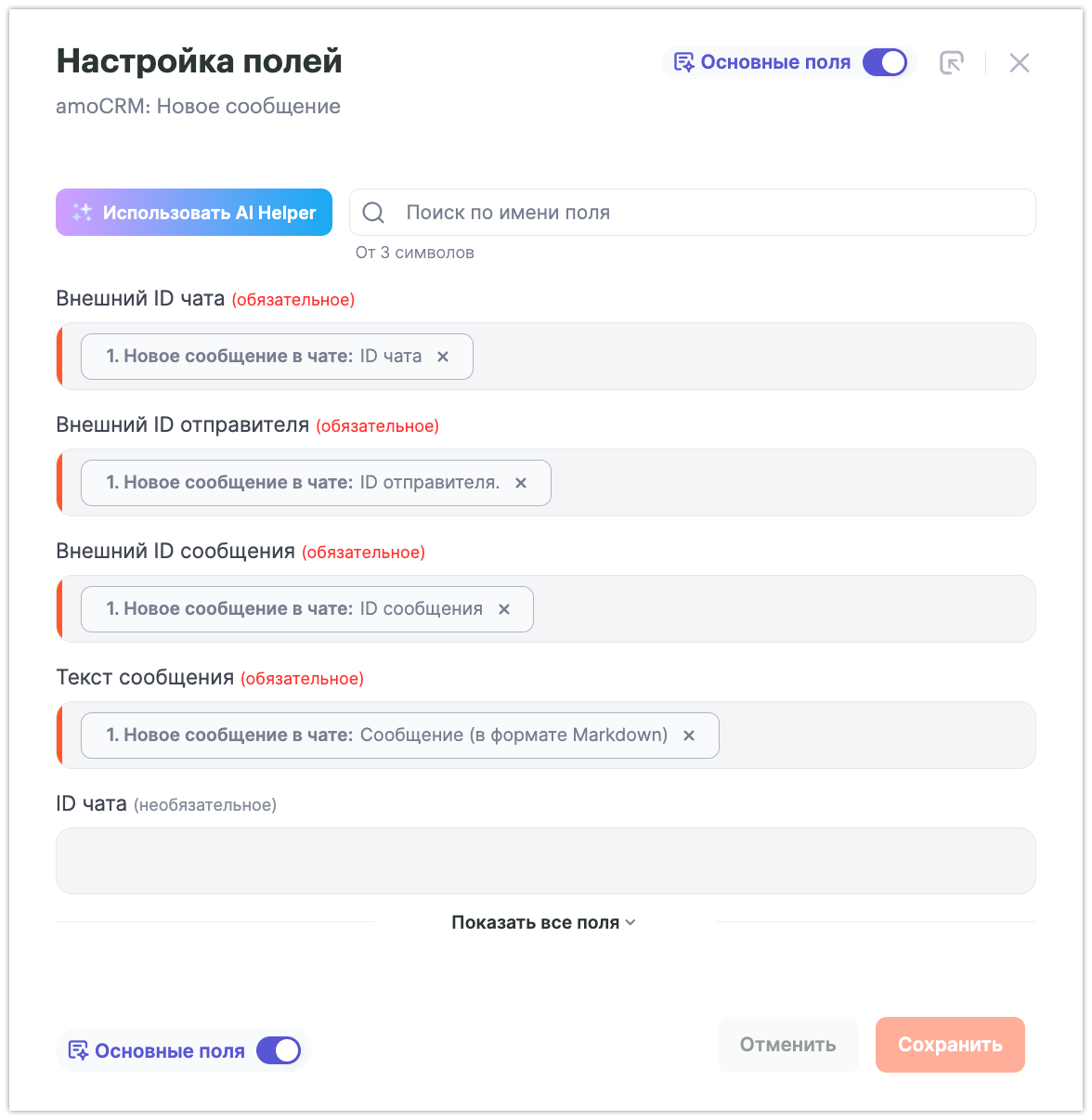 • В поле ID чата выберите параметр amoCRM: Внешний ID чата.