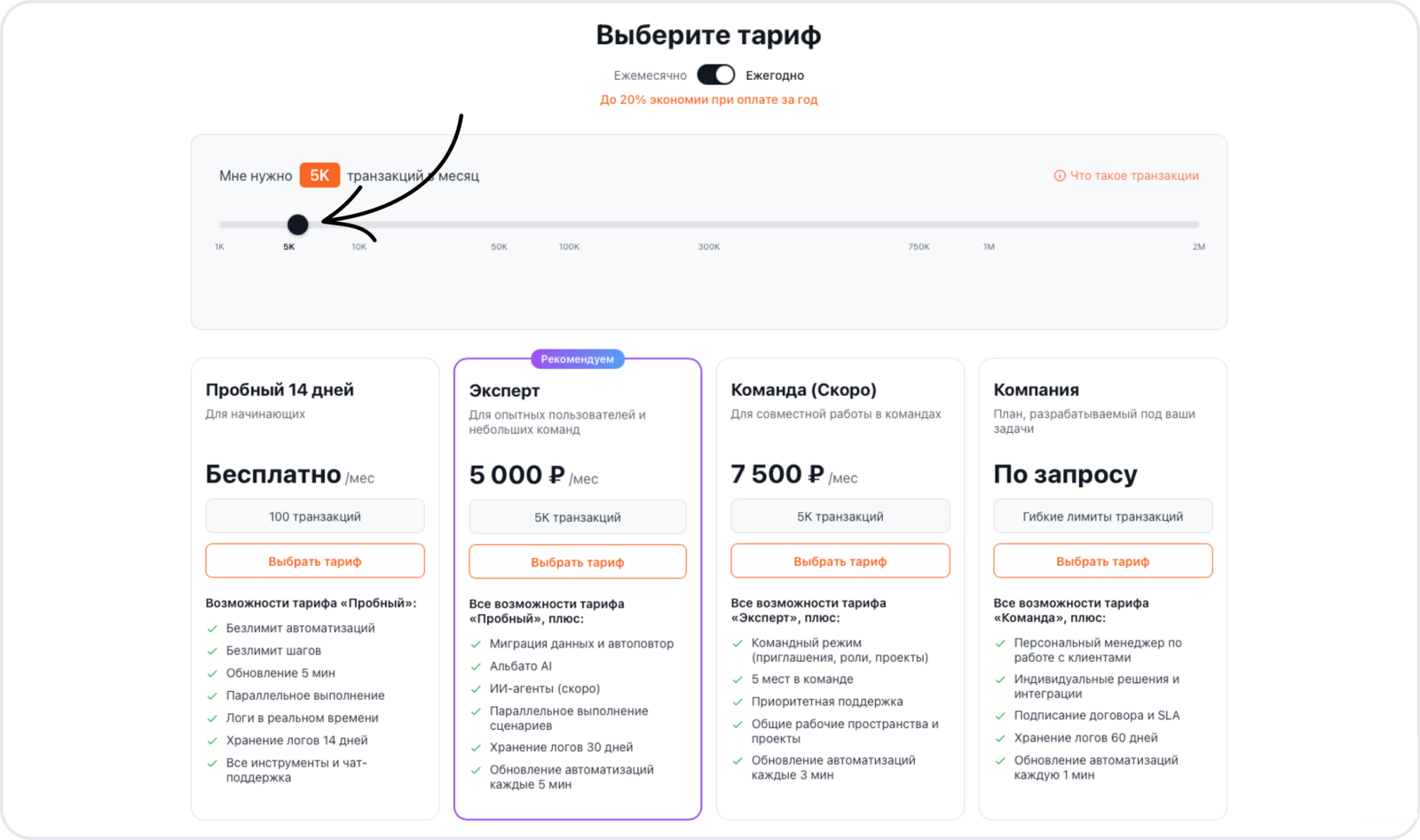 Обновление тарифной модели не влияет на текущую работу ваших связок. Вы продолжаете пользоваться Альбато в привычном режиме, а платформа подскажет, когда может потребоваться другой пакет транзакций. Все решения о переходах и изменениях вы принимаете самостоятельно.
