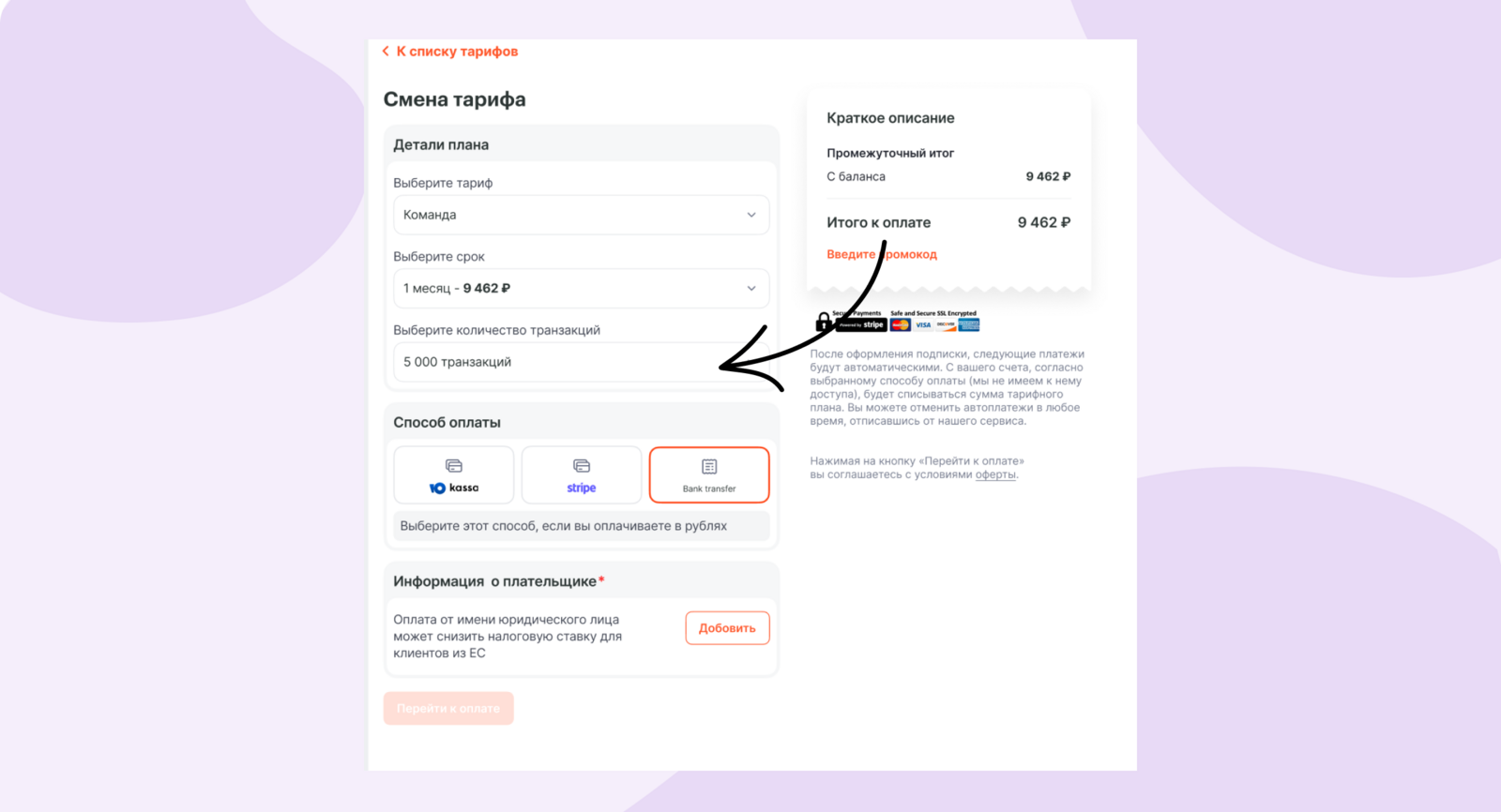 В новой модели тариф больше не определяет объём транзакций. Теперь он задаёт формат работы, а количество транзакций выбирается отдельно — в виде пакета, который соответствует вашей нагрузке.