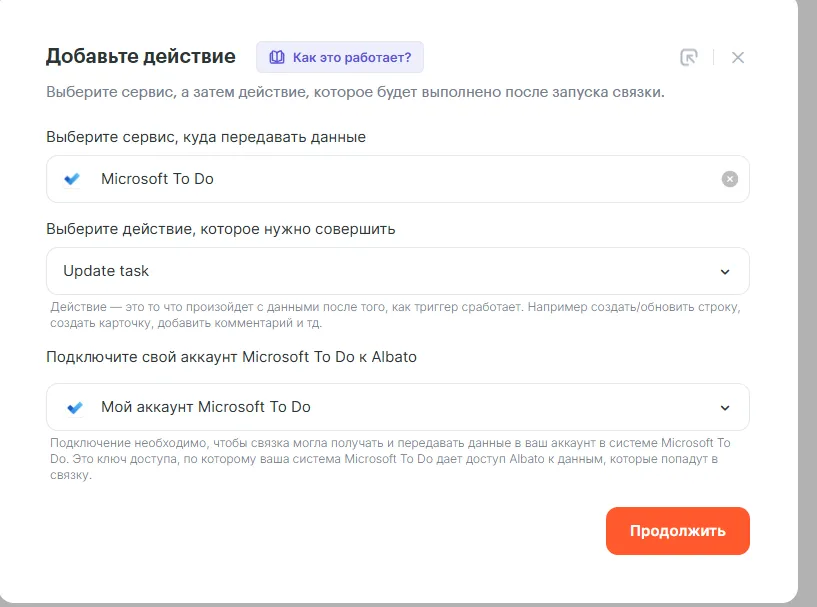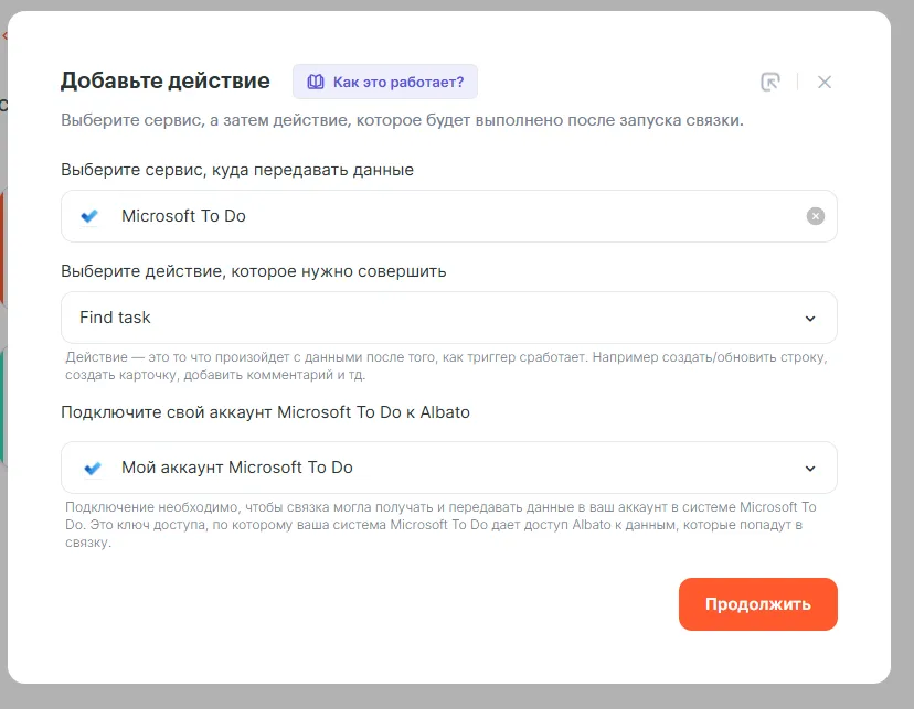 - Куда будем передавать данные – Microsoft To Do