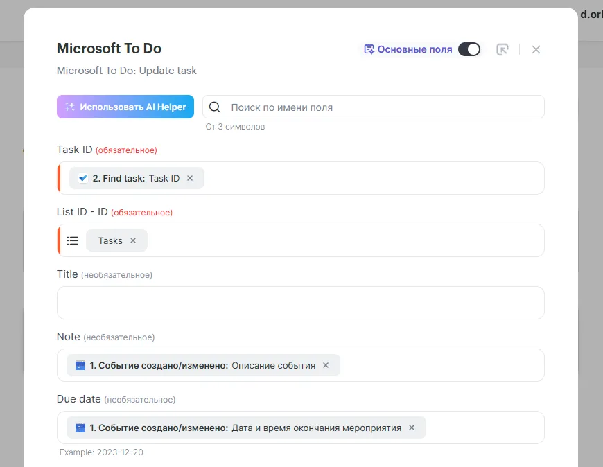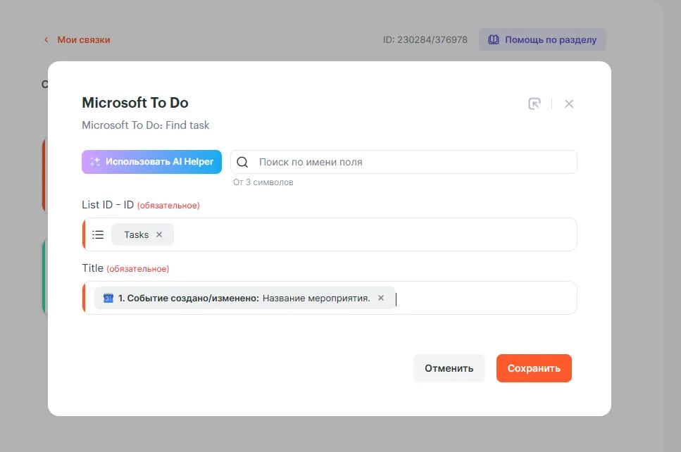 Выбираем нужный список и передаем Название мероприятия, по нему мы будем искать задачу в Microsoft to do. Названия должны совпадать, иначе задача найдена не будет.