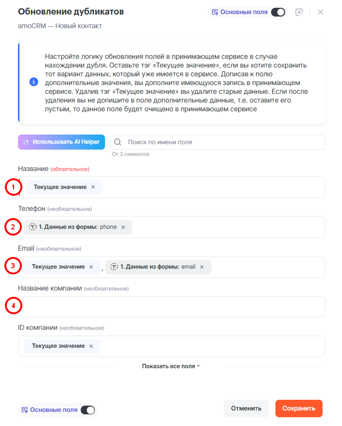 - Удалив тэг «Текущее значение» и оставив поле пустым, данное поле будет очищено в принимающем сервисе.