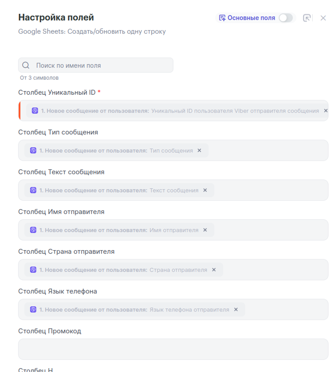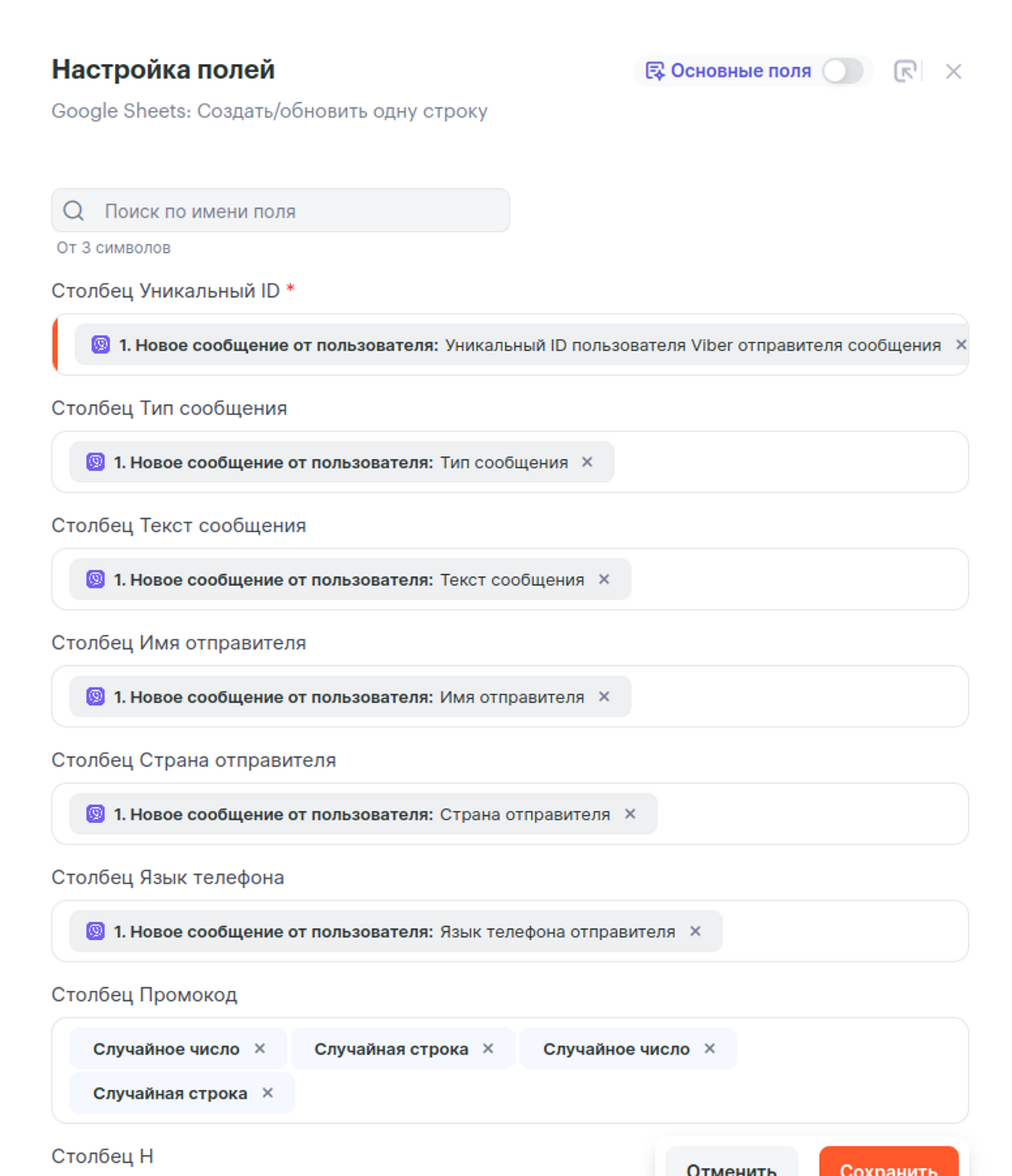 Добавляем данные в таблицу, указываем в какой столбец будут отправляться данные о сообщении и о пользователе. В столбце Промокод будет автоматически создаваться промокод из случайного набора строк/чисел