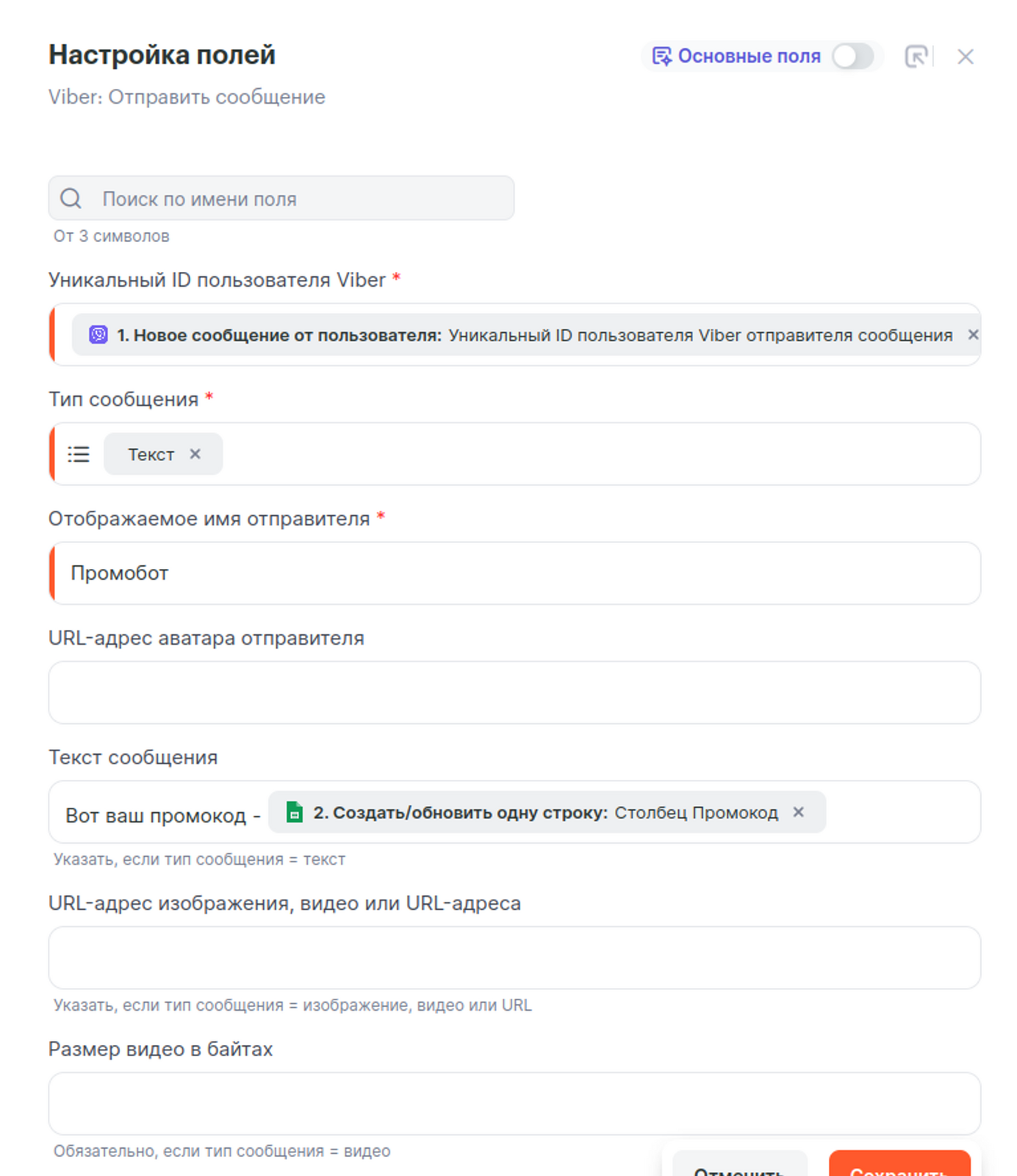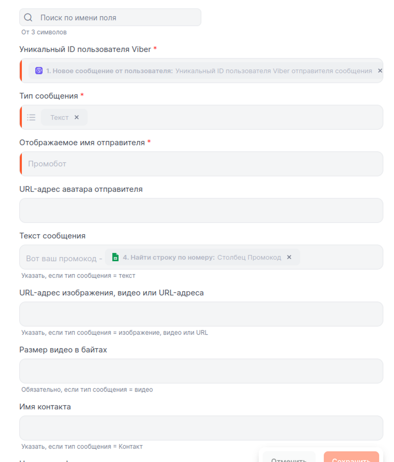 Отправка промокодов с помощью чат бота Viber (c заполнением вручную)