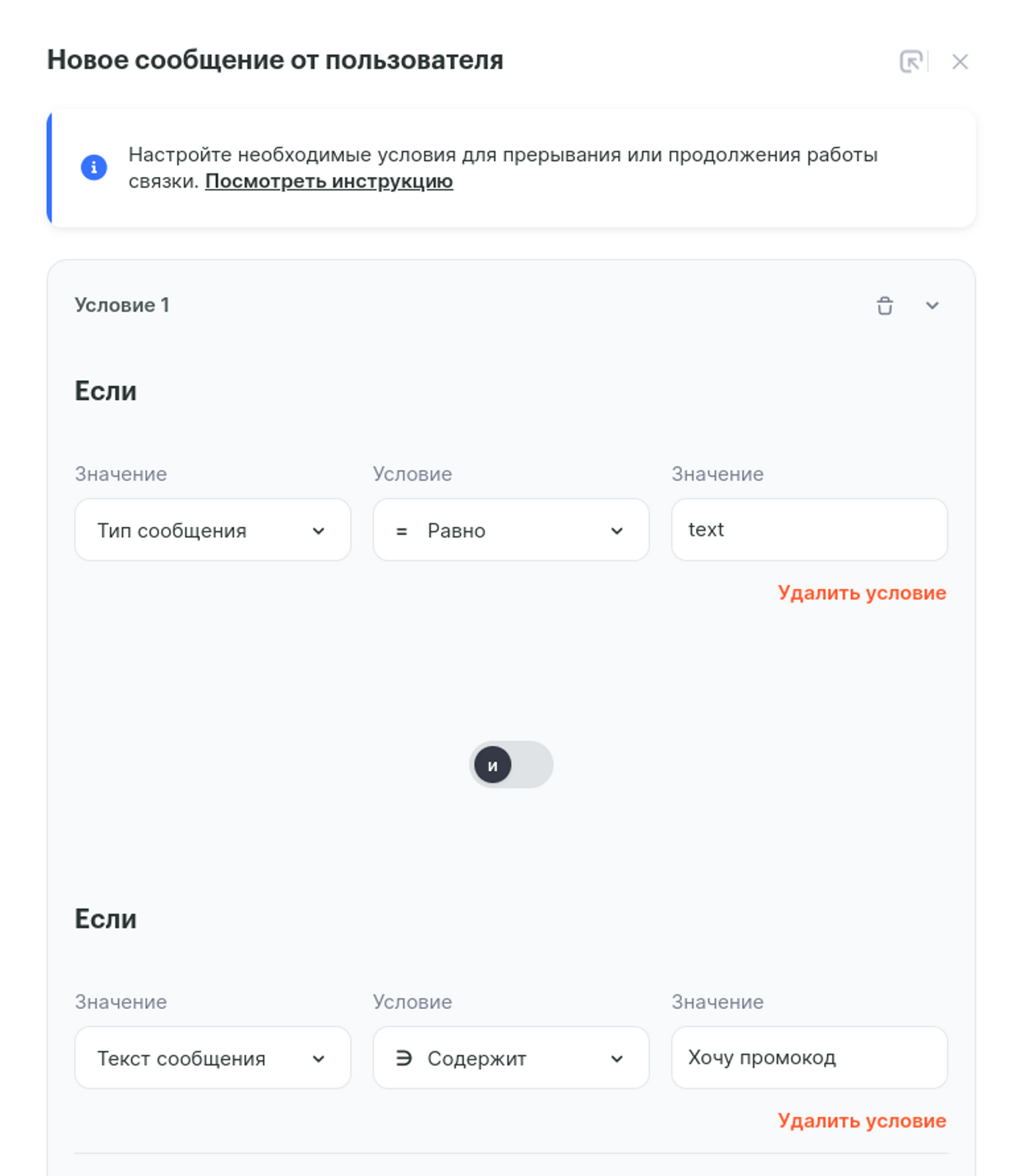 В первом шаге устанавливаем Фильтр входящих данных — Тип сообщения = text **и Текст сообщения **содержит ** **Хочу промокод, чтобы бот реагировал только на релевантные запросы. Фильтр можно установить под Вашу задачу.