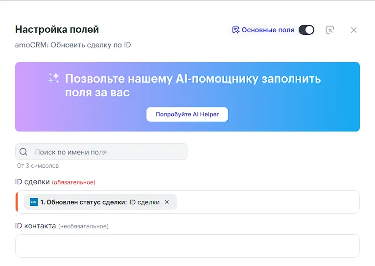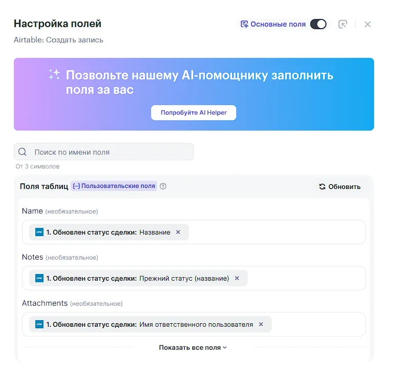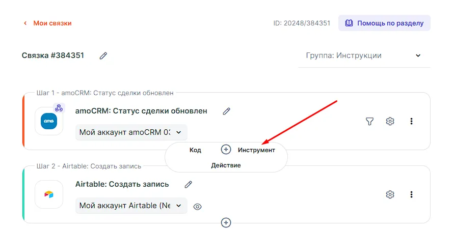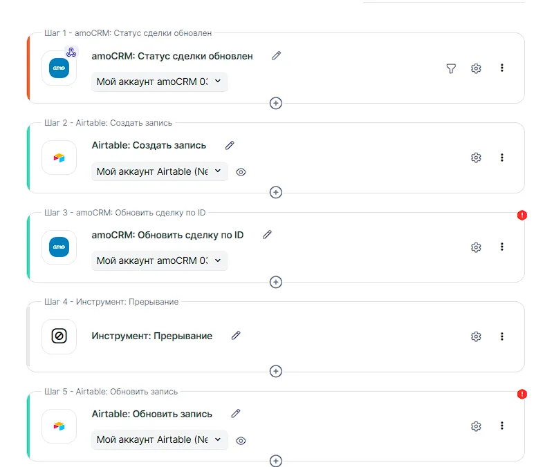 Рассмотрим пример создания связки, которая будет создать строку или обновлять имеющуюся в Airtable при обновлении статуса сделки в AmoCrm. Обращаем внимание, что длят акой связки необходим создать поле в сделке, где будет хранится параметр ID записи для Airtable.