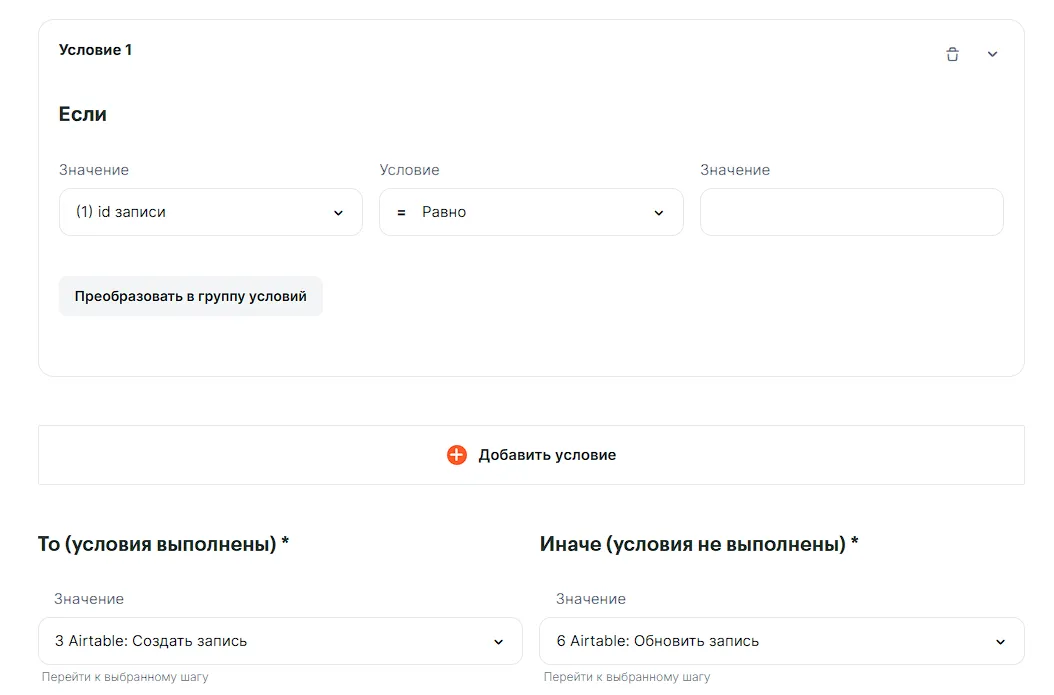 Переходим к его настройке: если поле ID записи в сделку пустое, то будем создавать новую запись и дописывать ее в созданное поле, иначе только обновить запись: