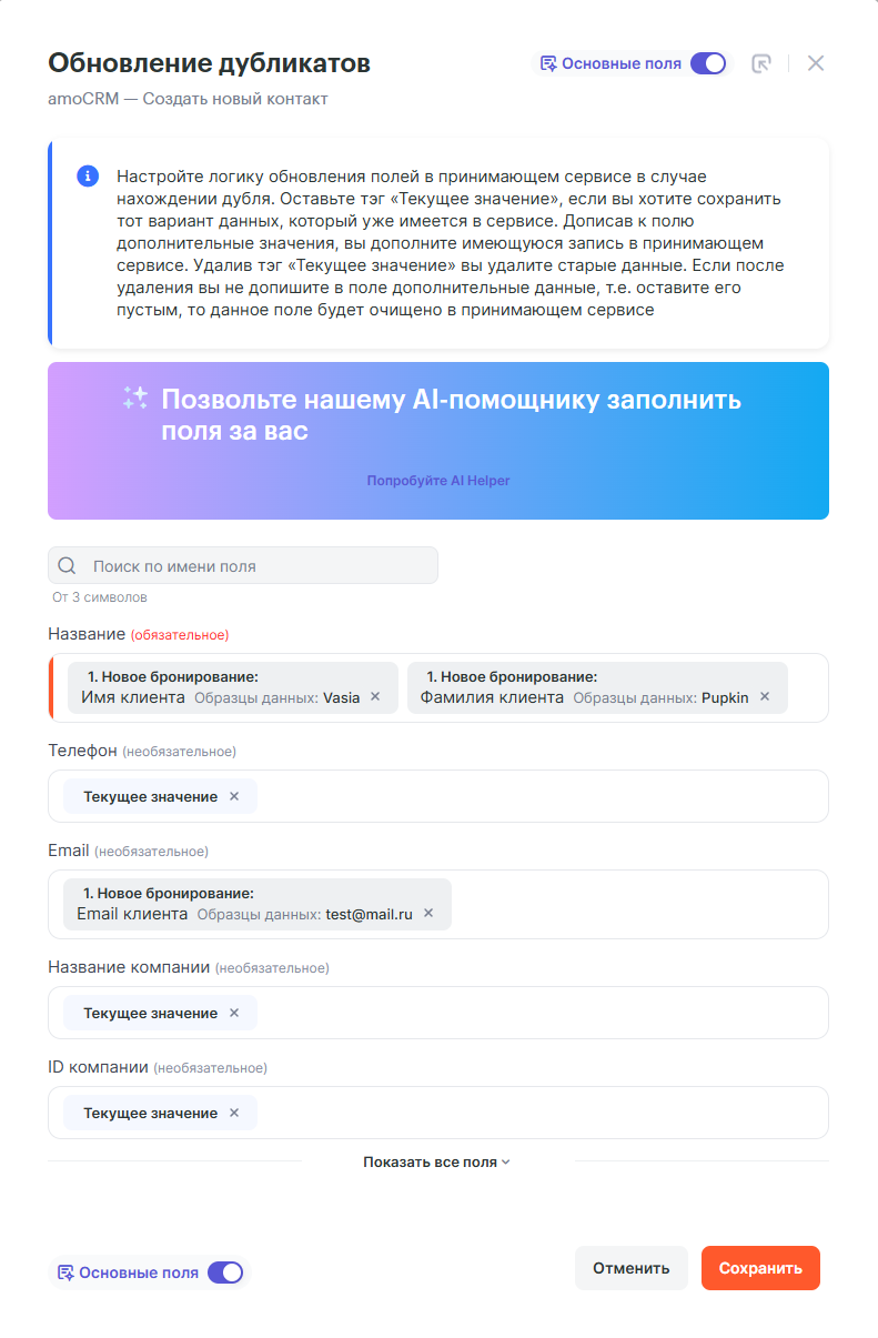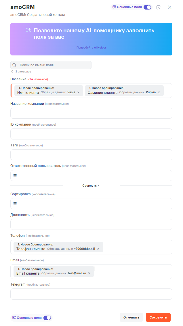 Заполняем поля Контакта данными из amoCRM. В название добавляем “Имя клиента” и через пробел “Фамилия клиента”, а также данными клиента заполняем поля “Телефон” и “Email”