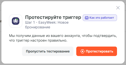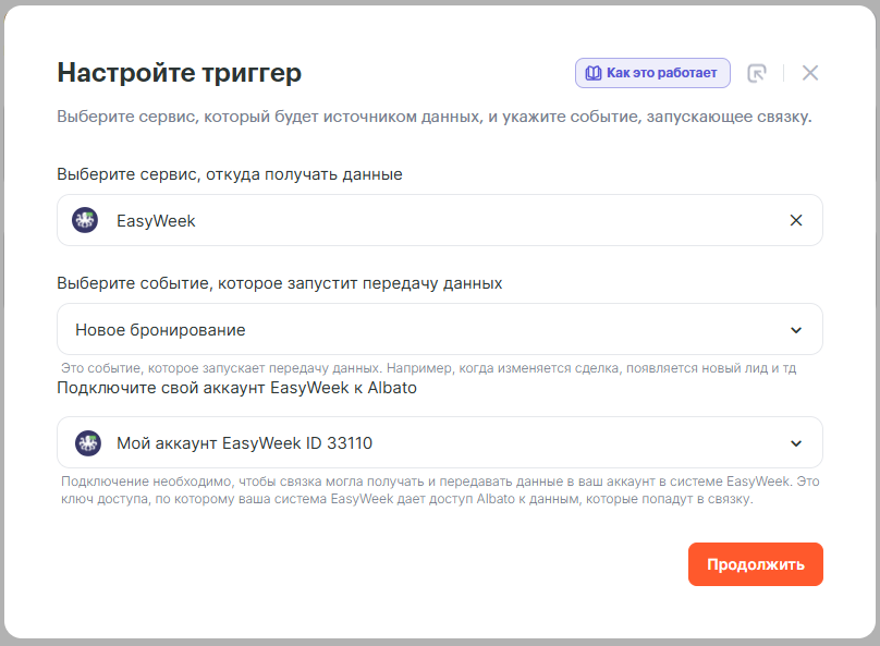 Нажимаем в связке на “Добавьте триггер, который будет запускать связку”, например в нашем случае данные будем передавать при обновлении задачи в EasyWeek, для этого выбираем триггер “Новое бронирование” и нажимаем “Продолжить”.