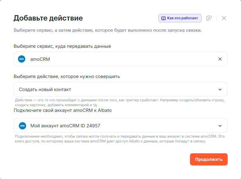 И в появившемся окне, выбираем Сервис amoCRM и Действие “Создать новый контакт”