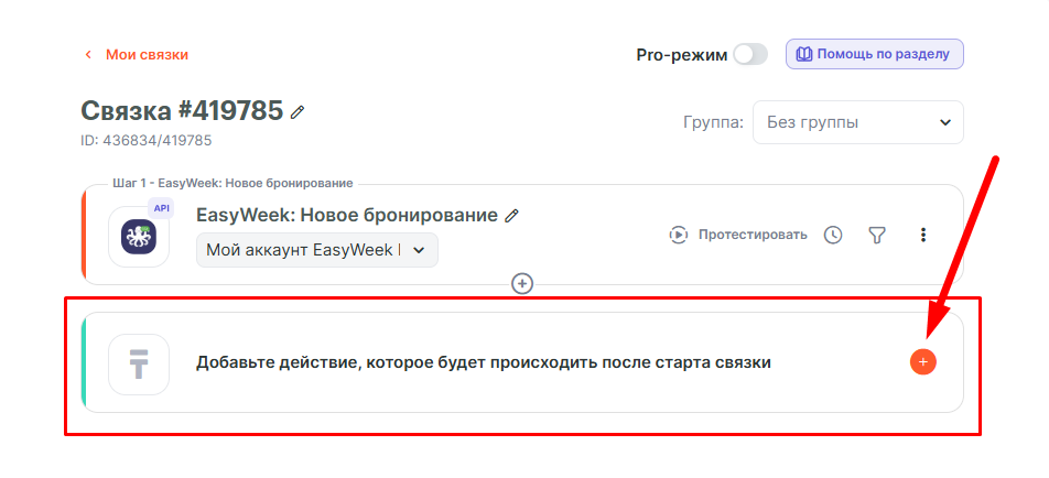 Добавляем следующий шаг, с его помощью мы будем в amoCRM создавать новый контакт. Нажимаем на “Добавьте действие, которое будет происходить после старта связки”.