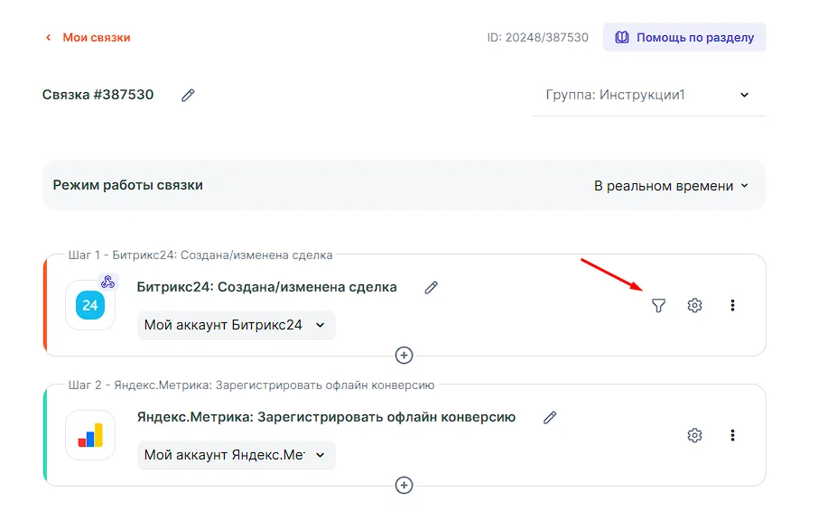 По нашей задаче, связка должна отрабатывать только при попадании на определенный статус, поэтмоу необходимо поставить фильтр входящих данных: