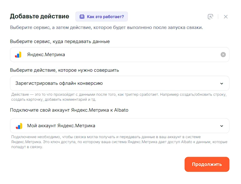 Перед созданием связки убедись, что оба сервиса подклюены к Альбато, а также на стороне срм собирается параметтр яндекс айди клиент и настроена сама цель в Метрике.