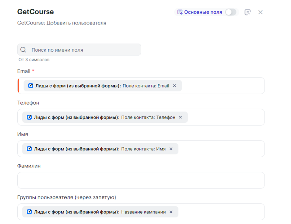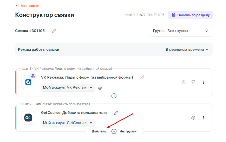 В данной инструкции рассмотрим пример создания связки, которая при заполнении формы в кабинете VK реклама будет создавать нового пользователя с добавлением в группу и новый заказ в GetCourse.