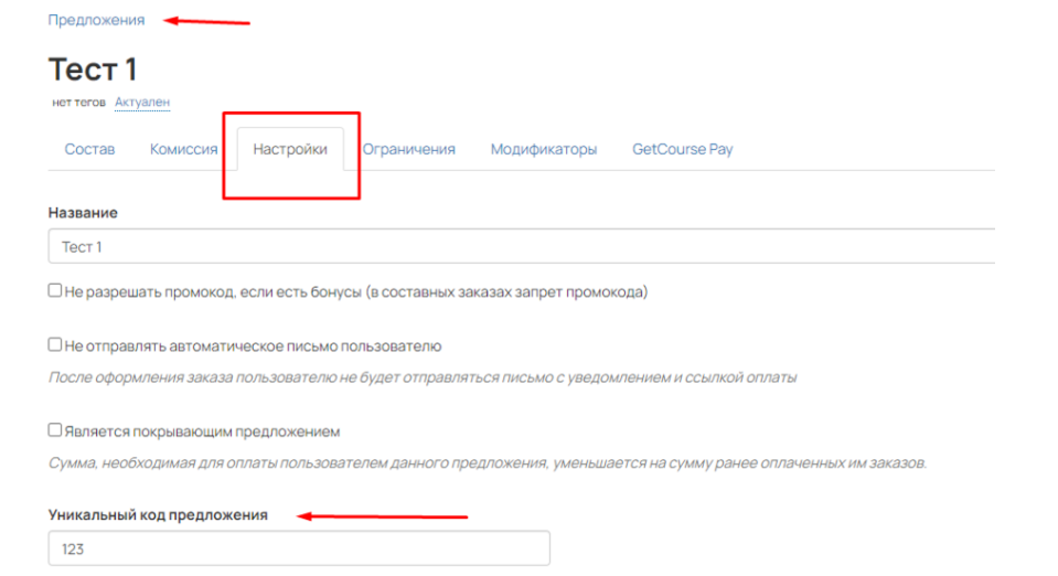 - Код предложения — вписываем статично 123, его указываем из настроек GetCourse, каждой форме в VK реклама будет соответствовать свой созданный код, для этого переходим GetCourse
