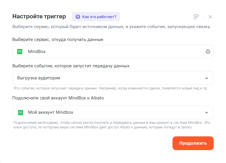 В качестве сервиса «откуда» выбираем Mindbox, событие – «Выгрузка аудитории», и указываем нужное подключение к Mindbox:
