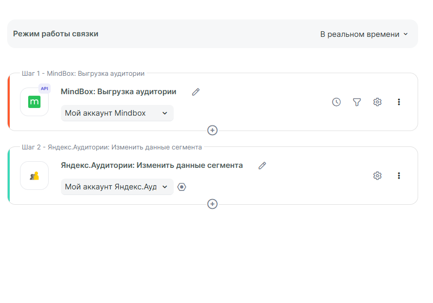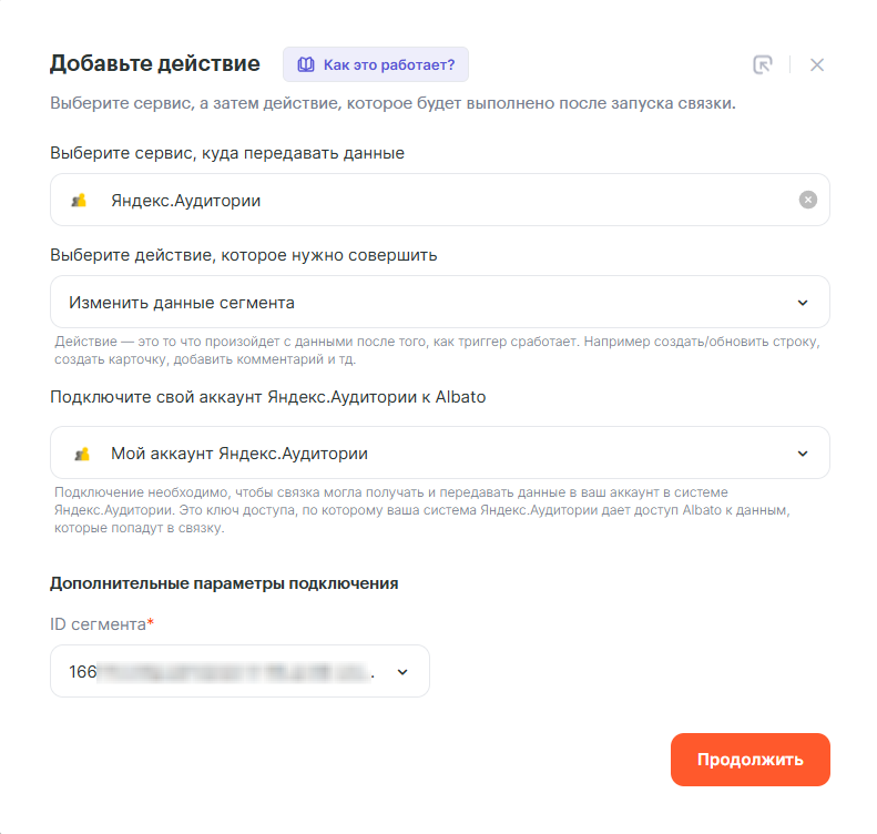 Переходим к следующему этапу создания связки. Выбираем в качестве принимающего сервиса Яндекс.Аудитории, действие — «Изменить данные сегмента», актуальное подключение к Яндекс.Аудиториям и заполняем дополнительные параметры подключения: