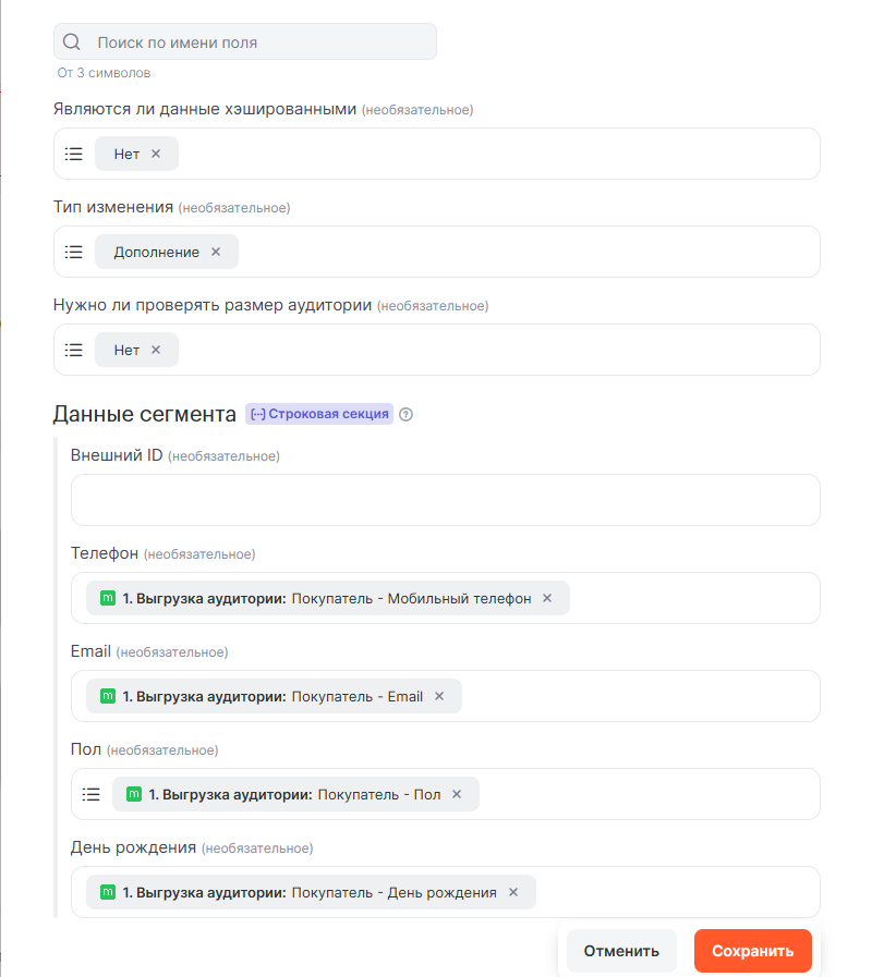 Заполняем поля Яндекс.Аудитории данными из Mindbox и нажимаем «Сохранить»: