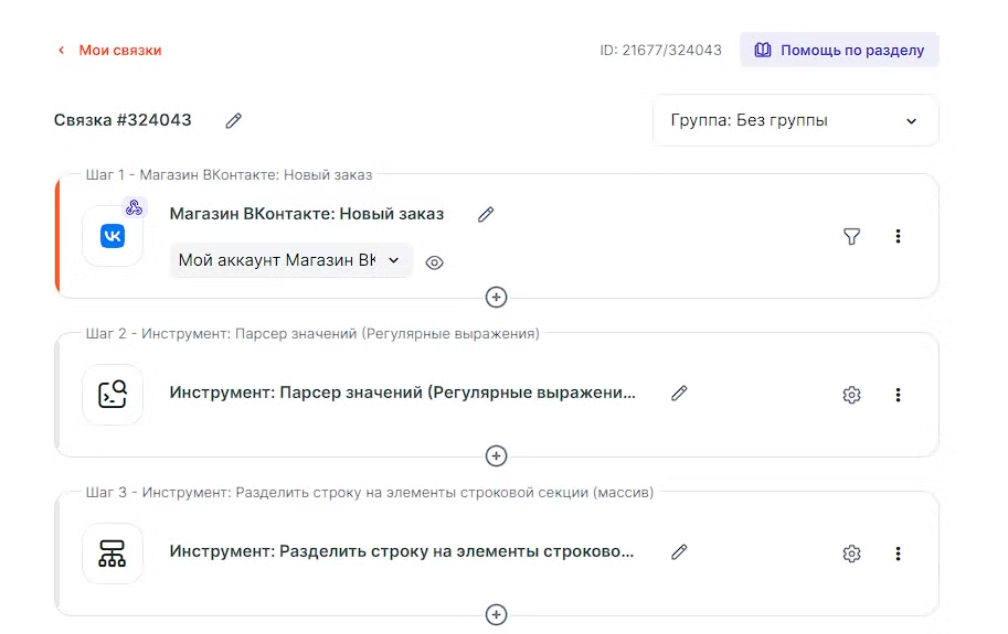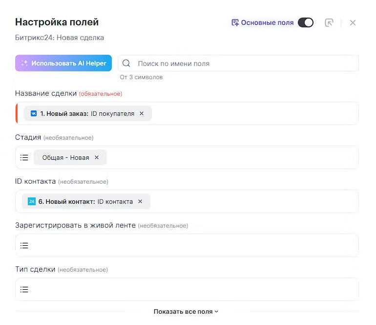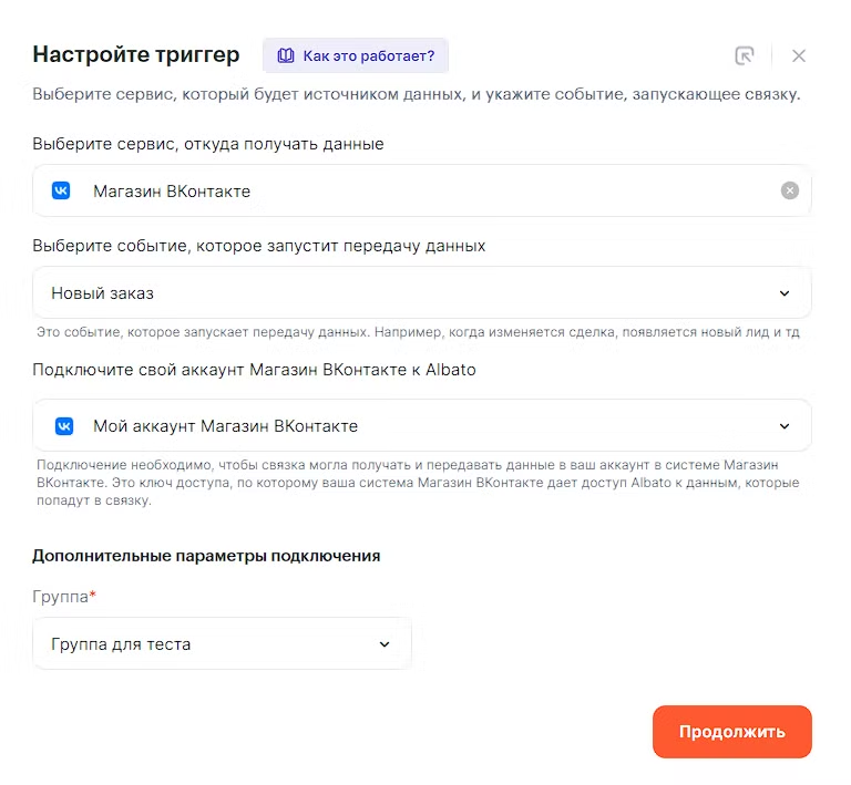 Рассмотрим кейс, в котором при создании заказа в Магазине ВКонтакте будет создан контакт и сделка в Битрикс24, в которой есть товары.