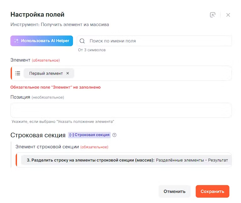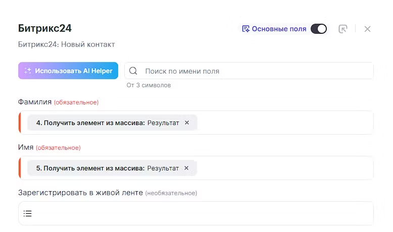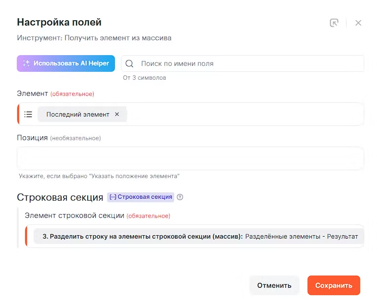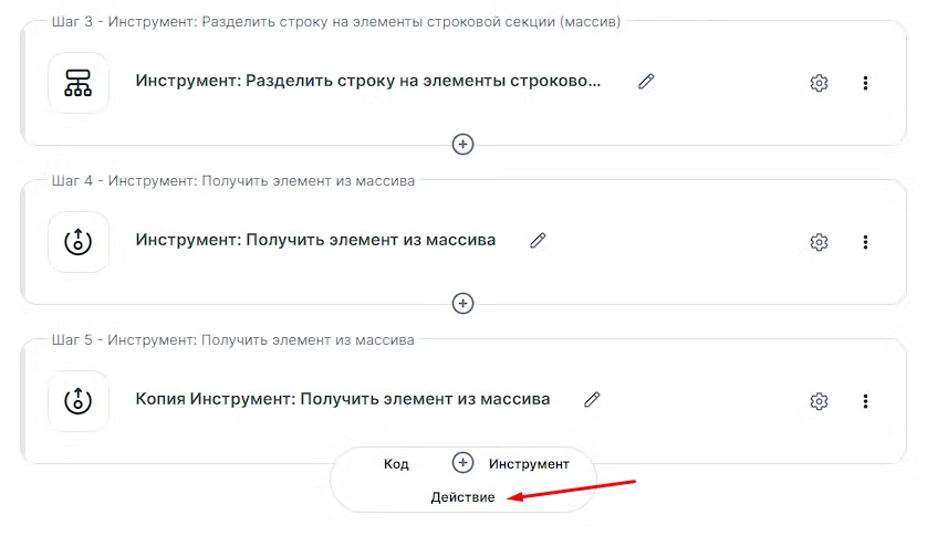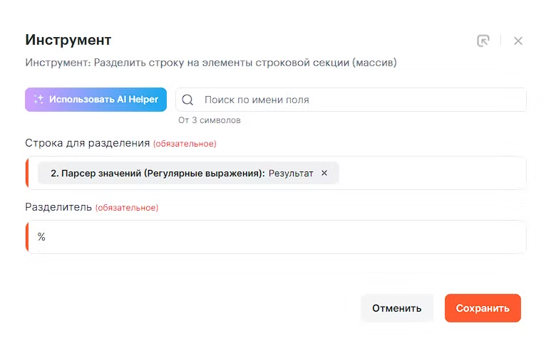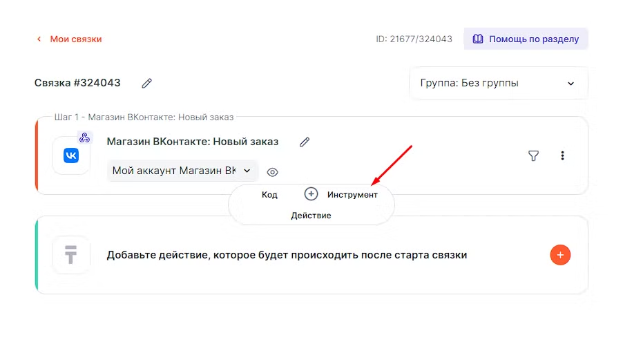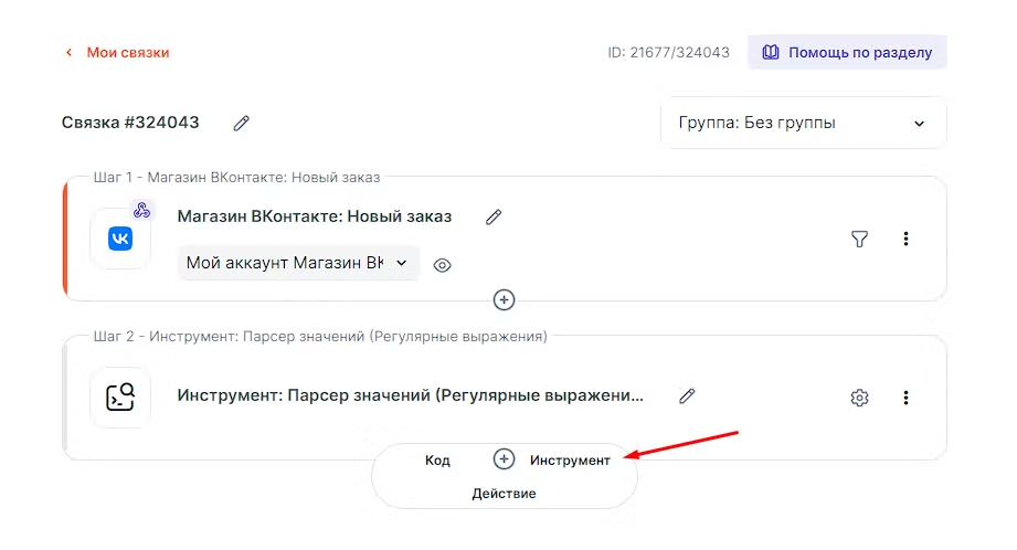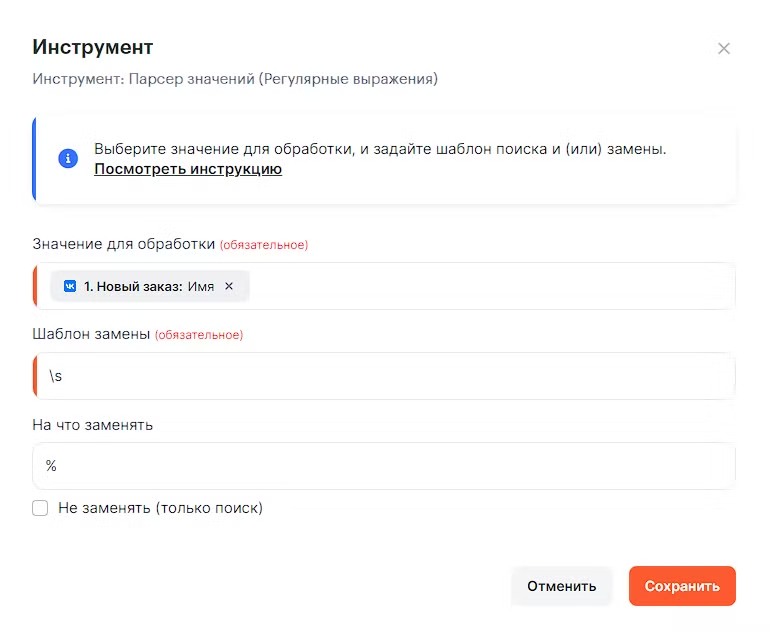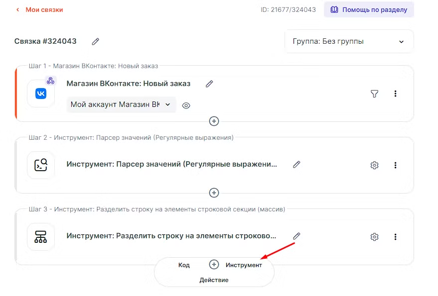 Из Магазина ВКонтакте имя клиента и фамилия приходят в одном поле, разделим его на 2 отдельных параметра, для этого добавляем Инструмент: