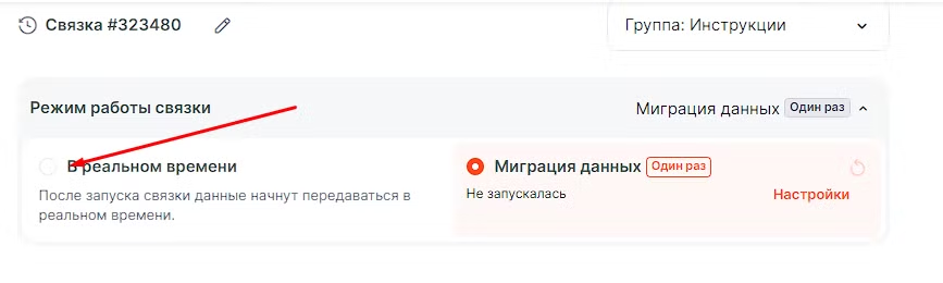 Нам нужно перенести товары, поэтому связку запустим в режиме миграции, по ее окончании переключим на режим реального времени: