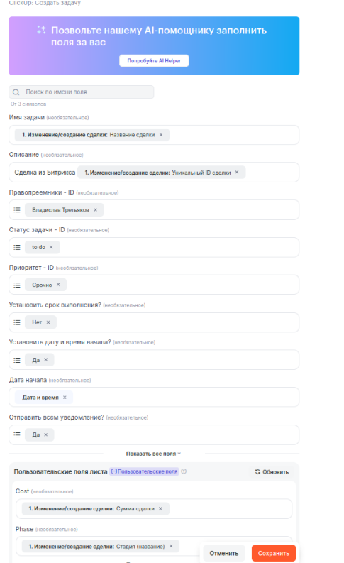 В данной инструкции мы рассмотрим связку по переносу контактов из Битрикс24 в ClickUp. Связку можно запускать как в режиме миграции данных (переноса всех контактов за определенный период), так и в режиме реального времени.