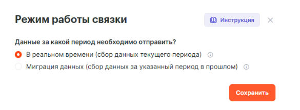 Нажмите кнопку Продолжить.* В следующем открывшемся окне нужно выбрать режим работы связки. Если выбрать *В реальном времени, то связка будет получать только новые созданные контакты, если выбрать режим Миграция данных, то можно будет выгрузить контакты за определенный период.