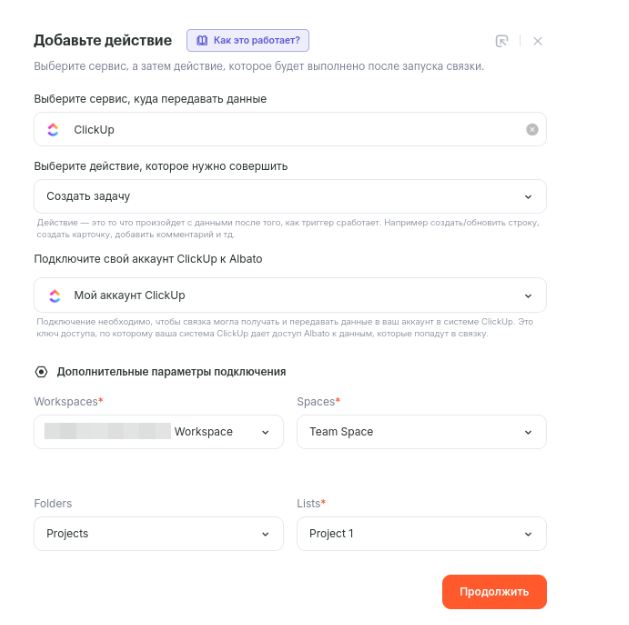 Помимо этого, в сервисе ClickUp потребуется выбрать такие обязательные параметры, как Workspaces, Spaces, Folders и Lists.