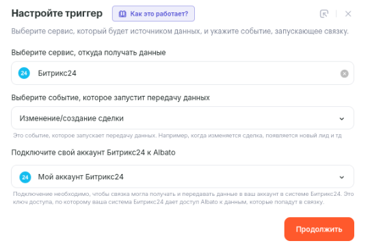 - Сервис, из которого будете получать данные — Битрикс24