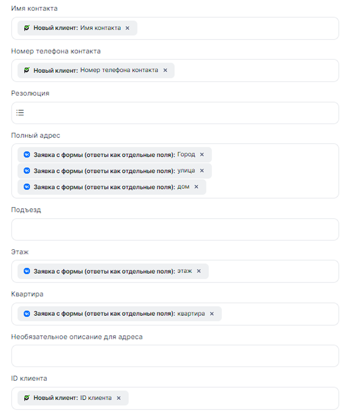 - Имя контакта и Телефон контакта — берем соответствующие поля из шага 1