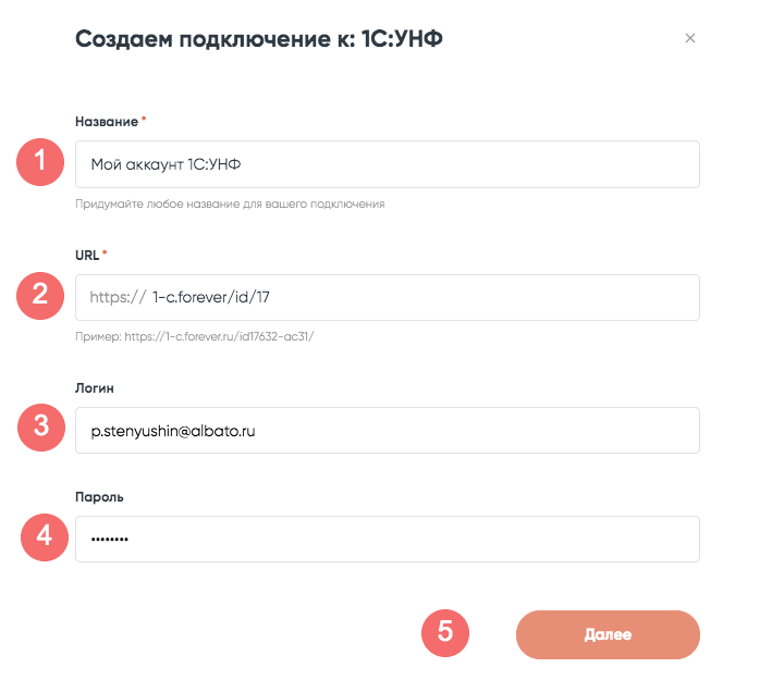 На открывшейся странице укажите произвольное название подключения, URL-адрес опубликованной на веб-сервере базы 1С и имя пользователя и пароль к базе данных, с которыми будет выполняться подключение по API. Затем нажмите «Далее» для сохранения настроек.