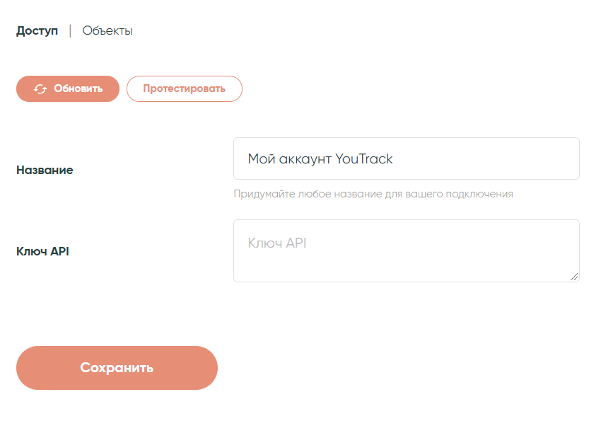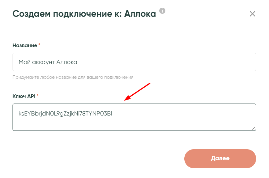 На следующем экране подключения нам нужно выбрать уникальное название, чтобы не перепутать аккаунты и роли, когда используется несколько подключений Аллока. Кроме этого, нам потребуется API ключ, который мы должны получить в самом сервисе Аллока.