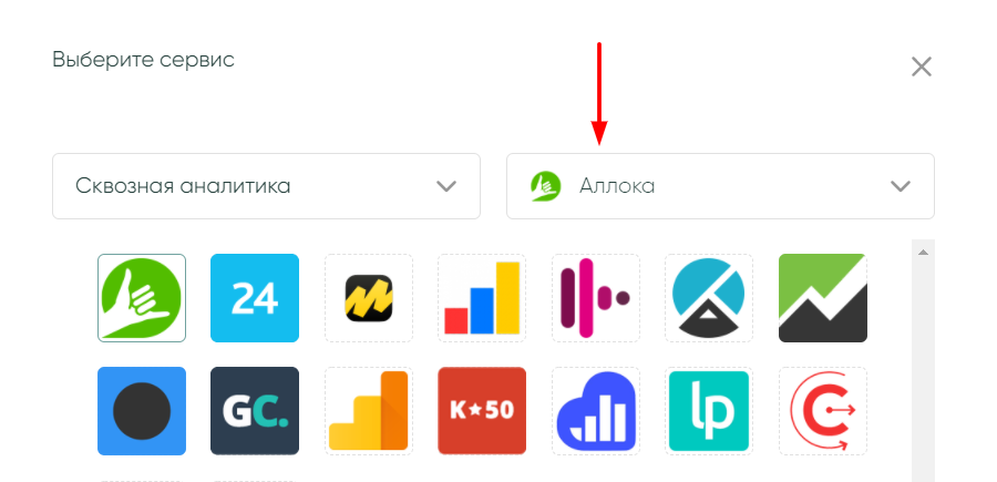 На экране выбора сервиса, вы можете использовать два подхода: воспользоваться поисковой строкой в правом блоке или выбрать сначала категорию — «Сквозная аналитика» и найти логотип сервиса в списке.