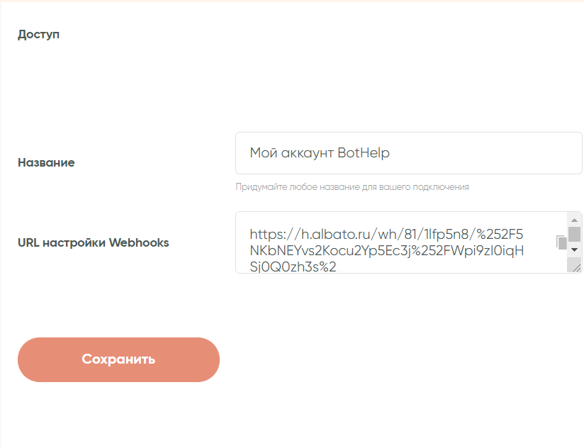 На новом экране нужно будет задать имя подключения. Воспользуйтесь таким названием, чтобы подключение было легко найти в списке. На этом этапе Albato сформирует вебхук, который нужно будет скопировать в настройки BotHelp.