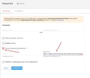 Для линейного бота — в настройках поставьте галочку «Экспорт данных пользователя». Пропишите в правом поле скопированный из подключения веб-хук.
