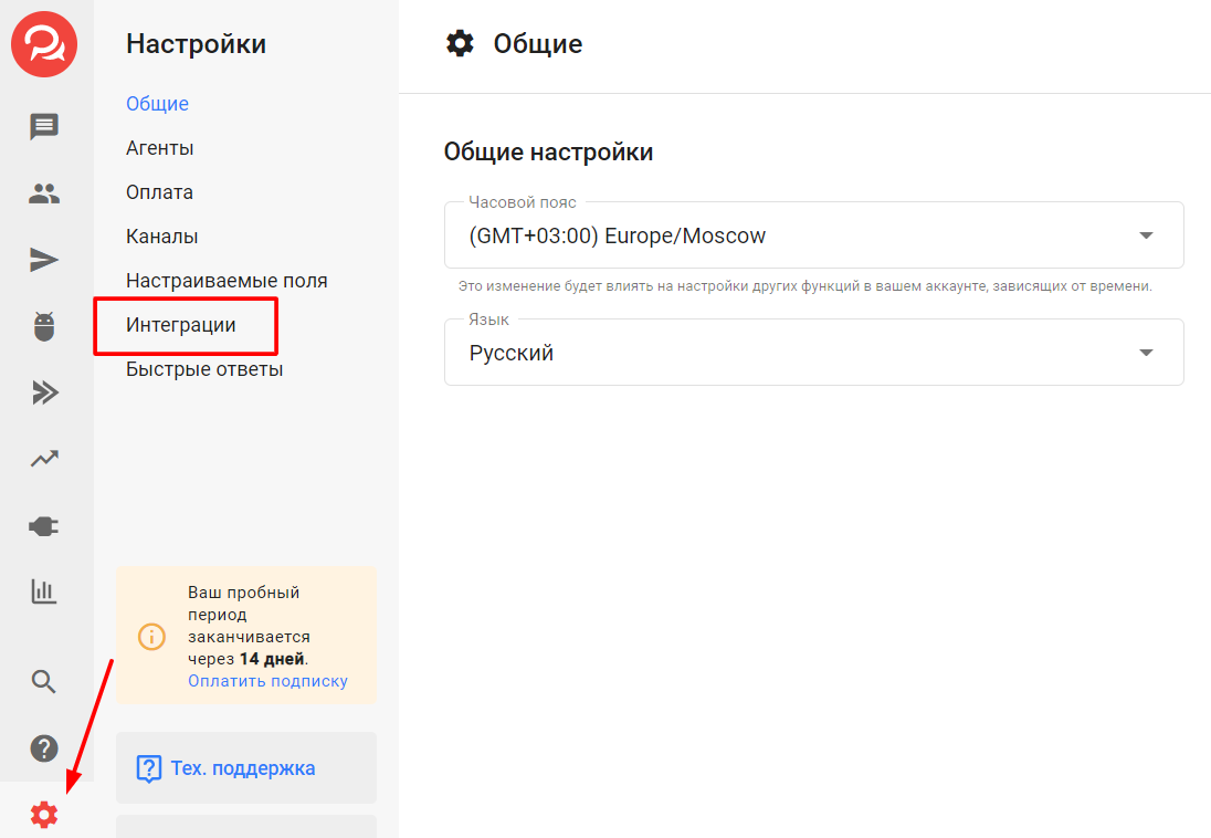 Откроем сервис BotHelp и перейдем в настройки, а далее в раздел «Интеграции», как показано на скриншоте: