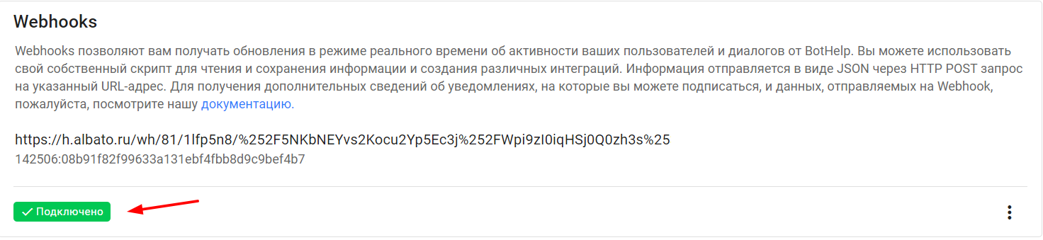 Если все сделано верно, система примет вебхук и кнопка изменит цвет на зеленый, как показано на скрине: