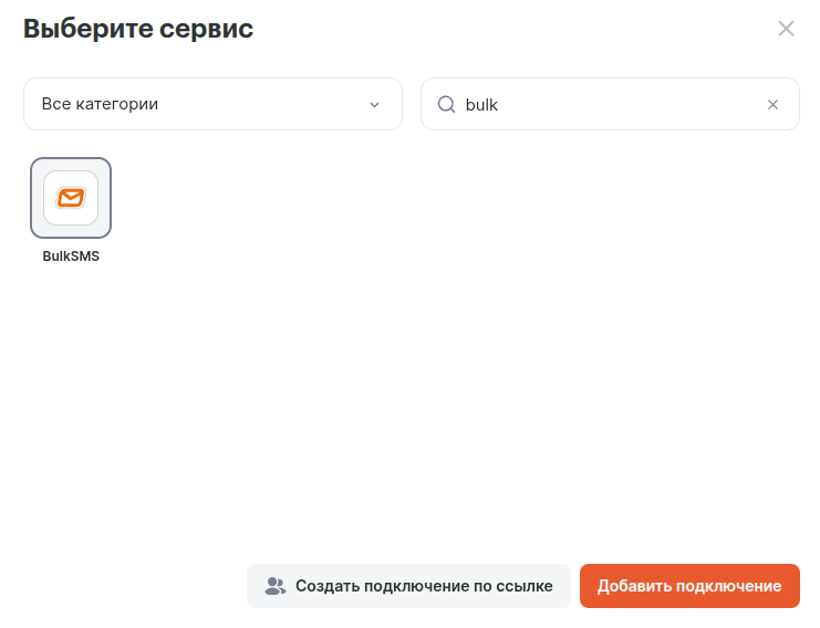 В новом окне можете воспользоваться поиском, чтобы быстро найти и выбрать сервис BulkSMS. Нажимаем «Добавить подключение».