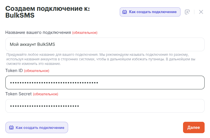 В поля Token ID **и **Token Secret вставляем скопированные токены из BulkSMS и нажимаем Далее.