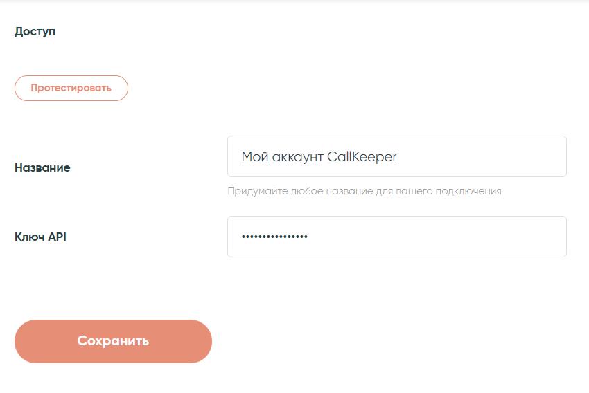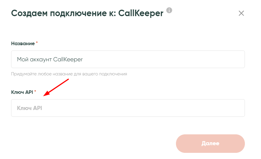 На новом экране следует задать название для подключения, чтобы была возможность легко найти его в списке прочих ваших подключений. Кроме этого, следует задать ключ API, который мы возьмем из самого сервиса Callkeeper.