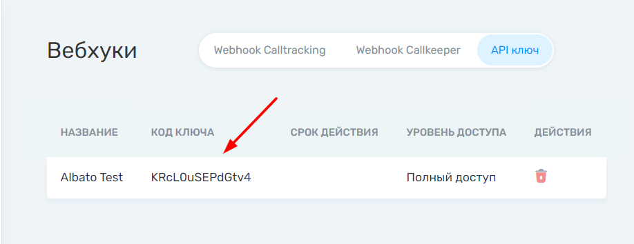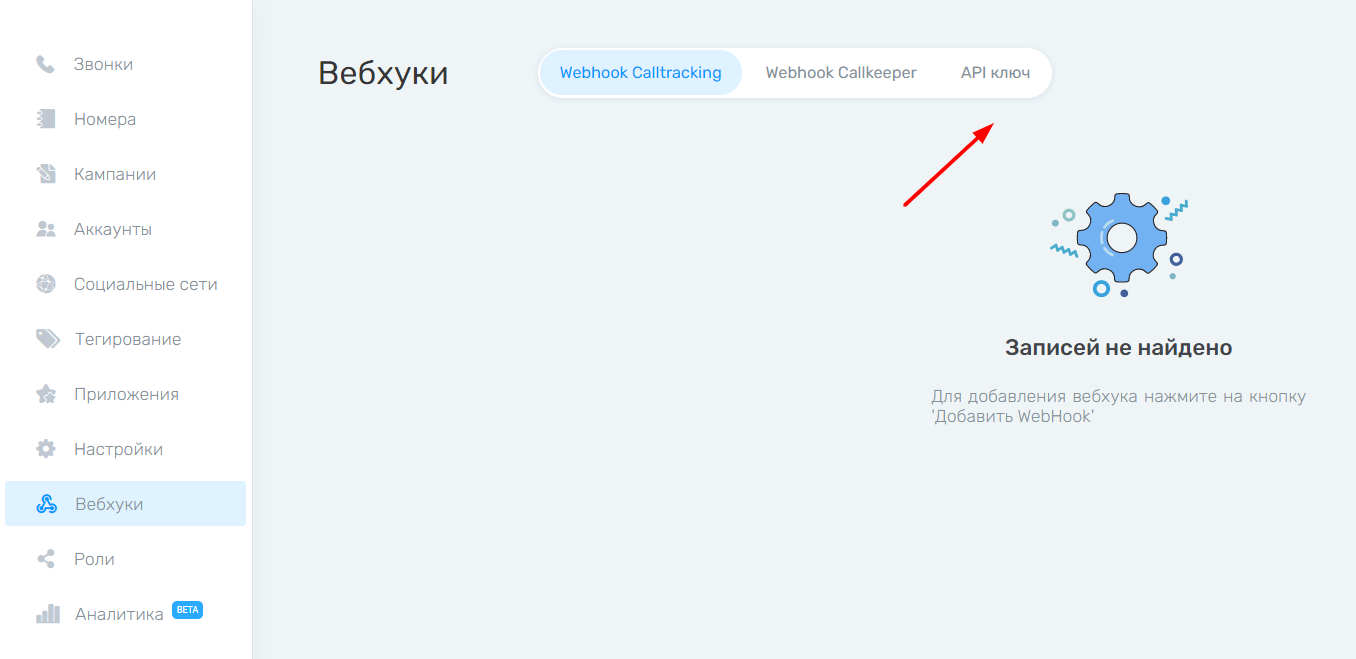 Не закрывайте настройки подключения в Albato и перейдите в Callkeeper. Зайдите в дашборд и перейдите во вкладку «Вебхуки», а далее перейдите во вкладку API ключ.